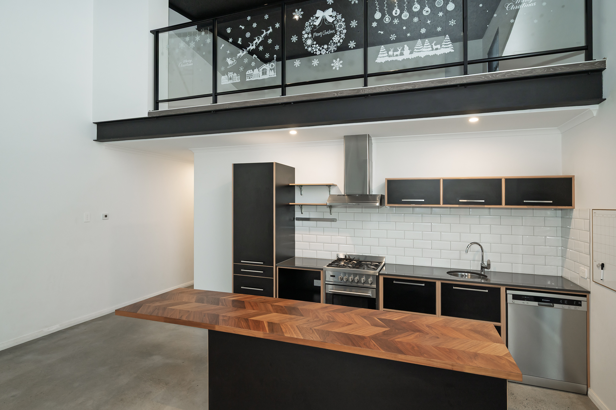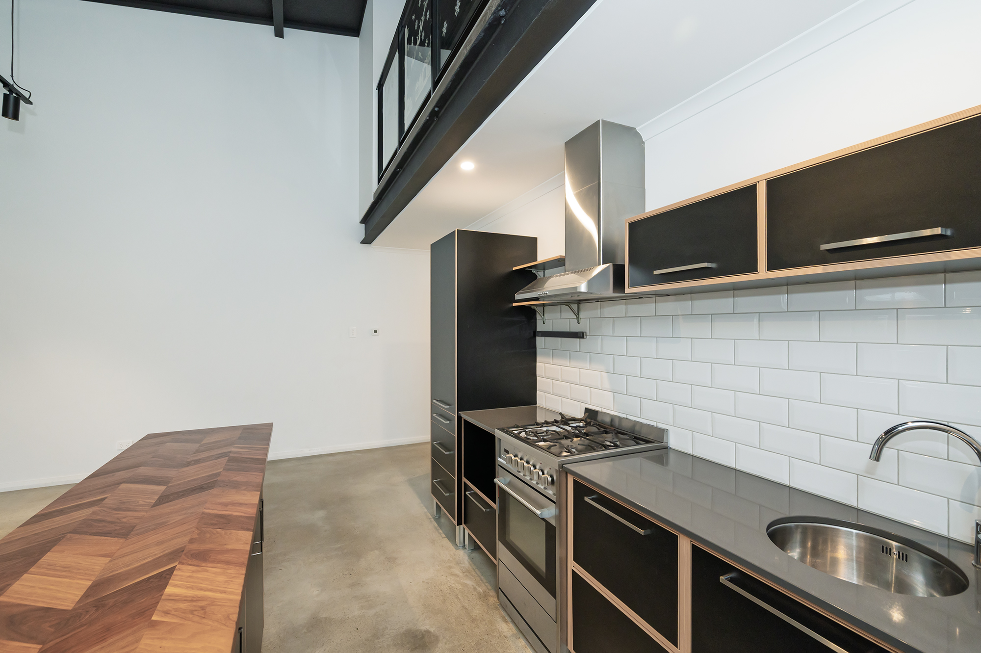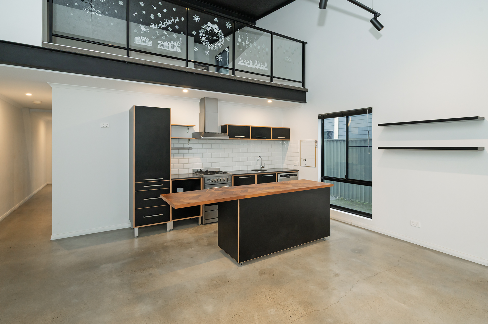 • Open-plan living with soaring ceilings, polished concrete floors, and a striking black-and-white kitchen with timber accents.