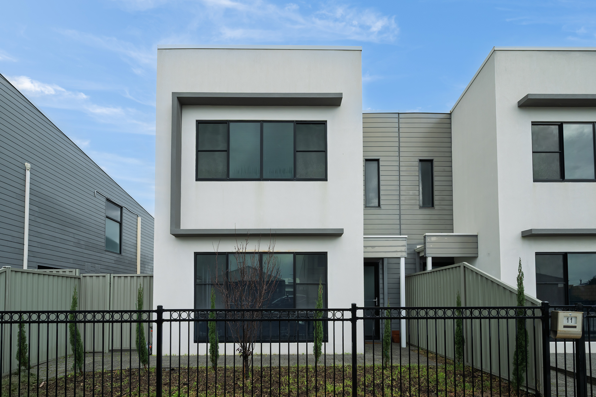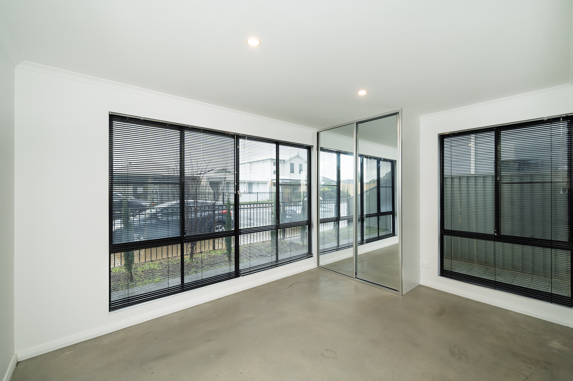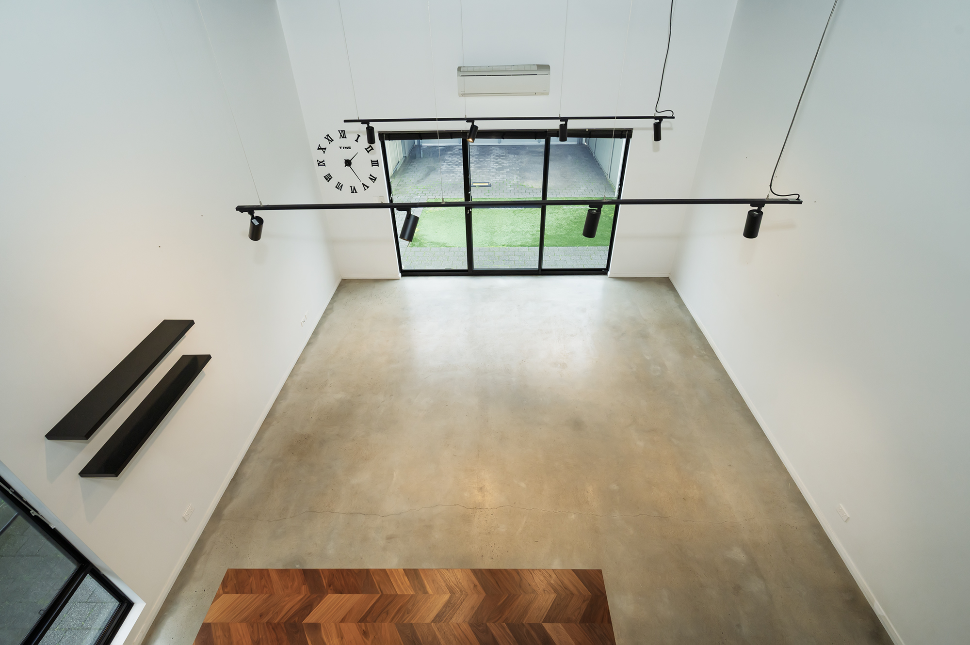 • Open-plan living with soaring ceilings, polished concrete floors, and a striking black-and-white kitchen with timber accents.