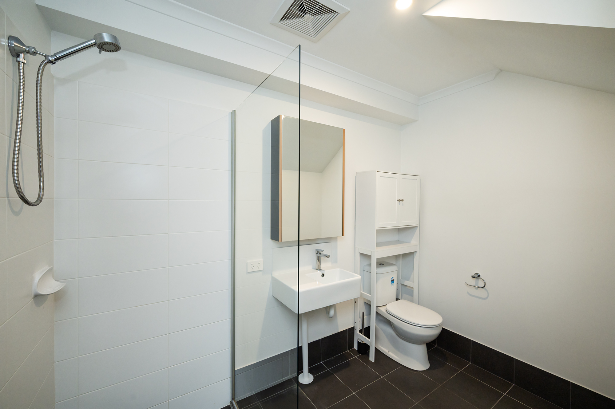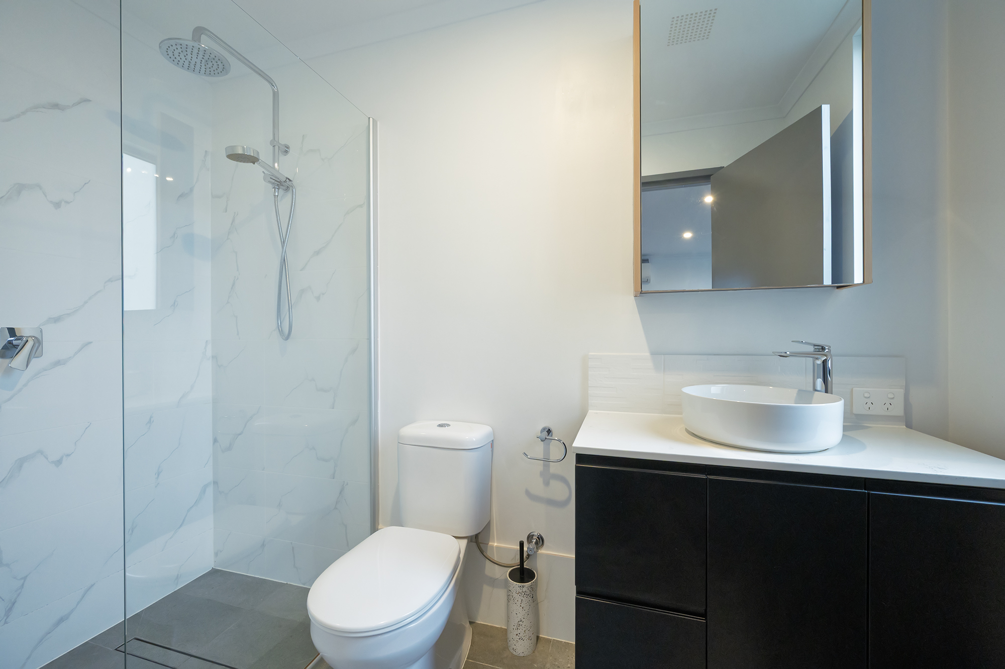 • Modern bathrooms with floor-to-ceiling tiles, walk-in shower, and sleek finishes.